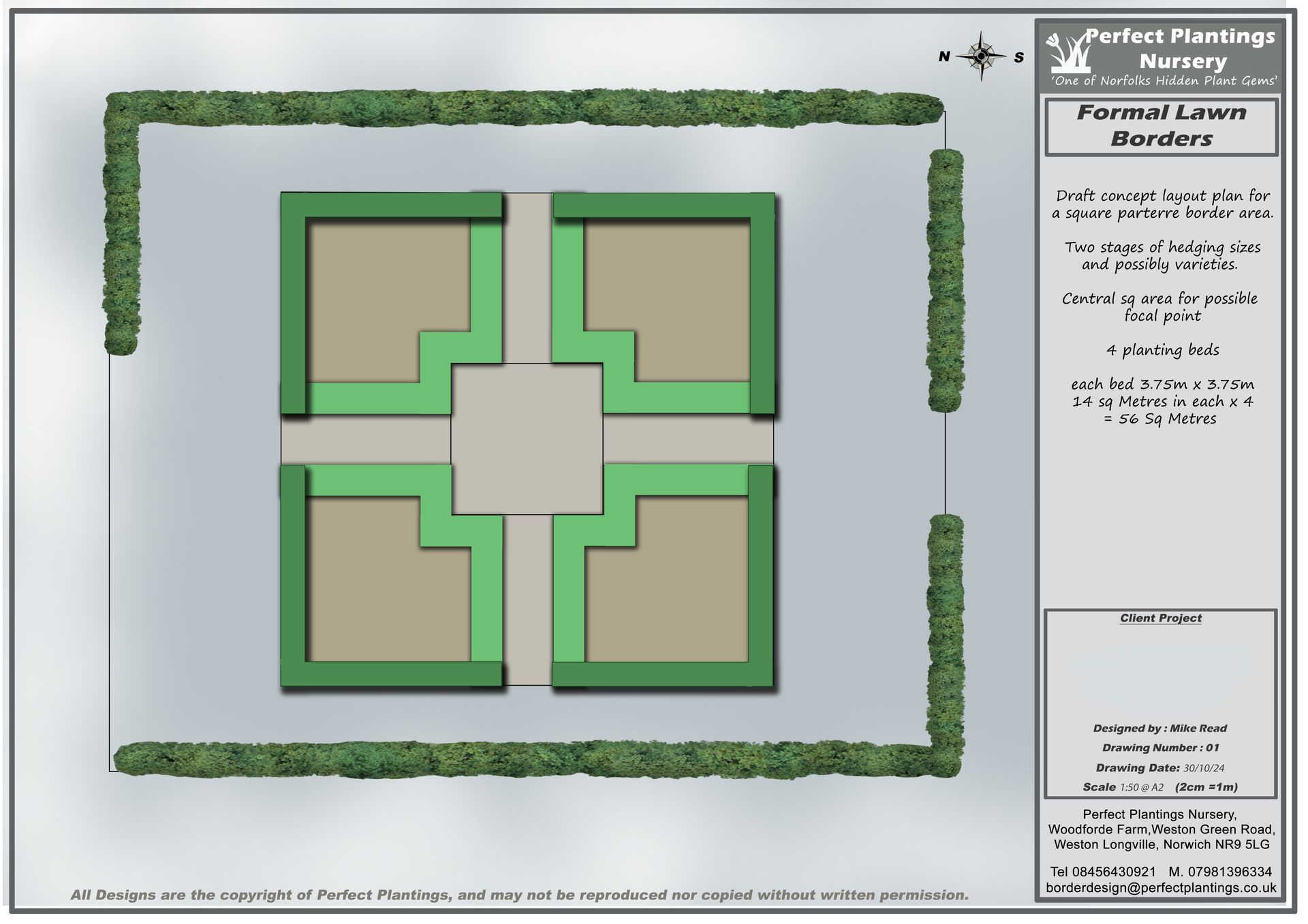 The concept layout plan for a modern take on a parterre style area, set into an existing lawn.