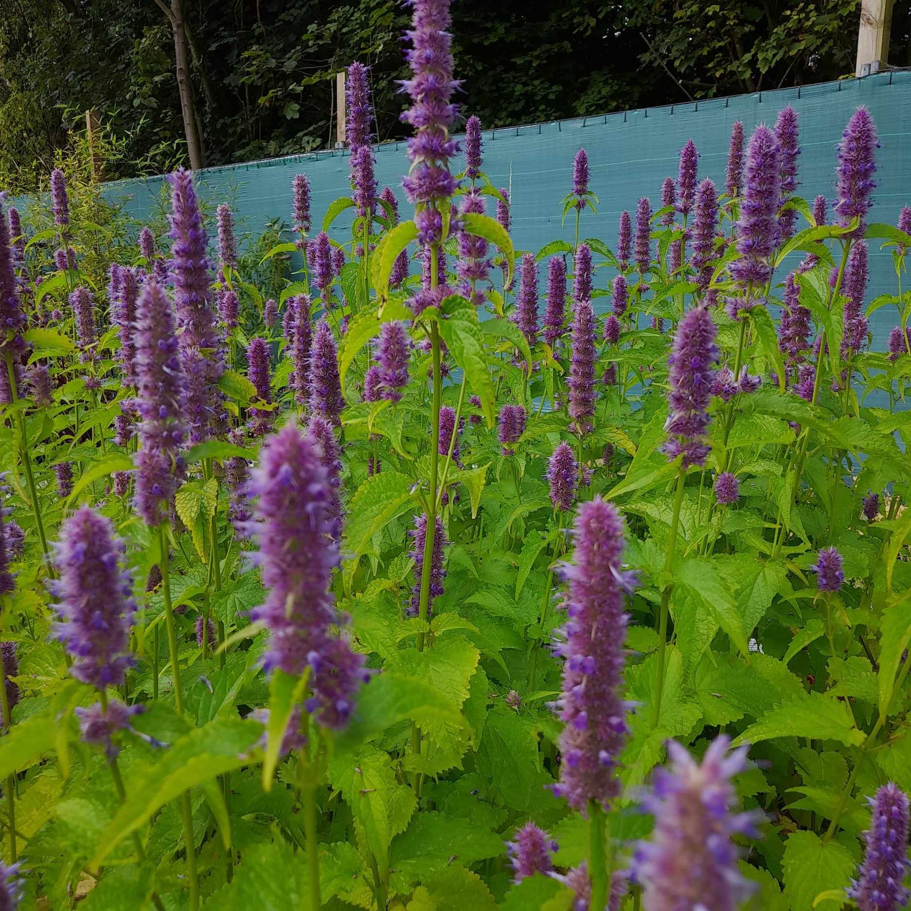 A mix of hot flower colours set against some light blue & gold will stand out against the hedge colours.